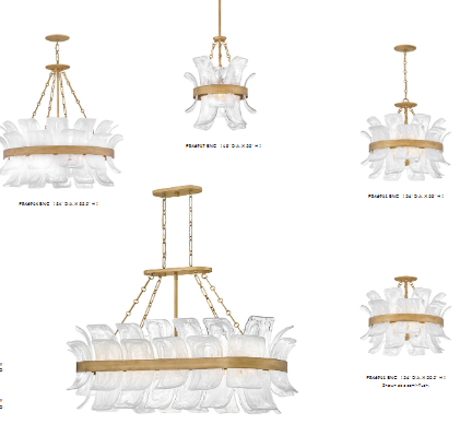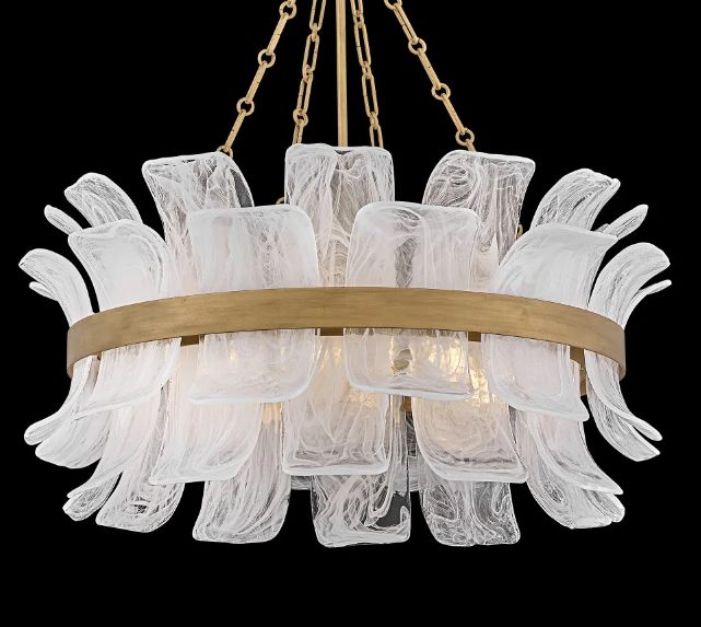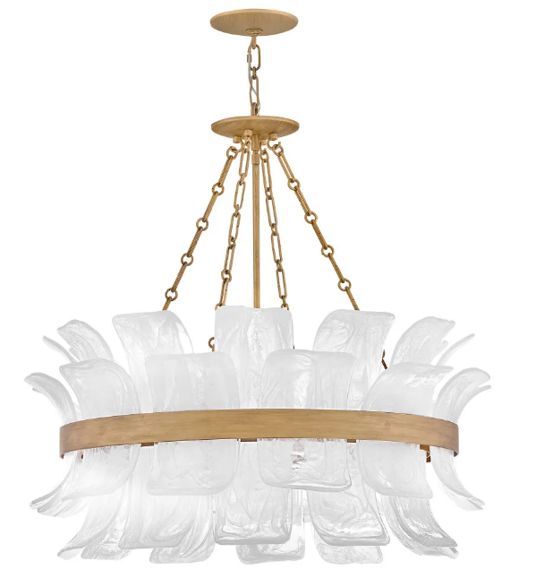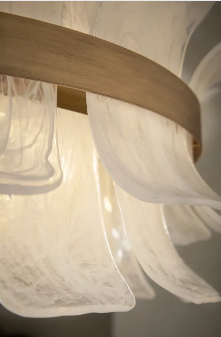 Deftly slumped and artfully arranged sheets of swirled glass appear to unfurl from Fleur’s beautiful drum silhouette, complemented by a central band hand-painted in Burnished Gold. White, cloud-like layers softly diffuse inviting illumination from warm candelabra lamps, creating an enchanting atmosphere.