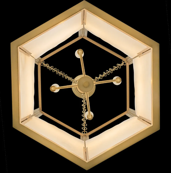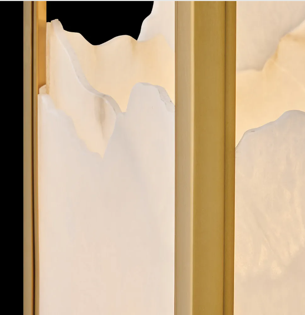 Inspired by snowy mountain peaks, Veleta’s natural alabaster shade with jagged top edges is showcased by a geometric Lacquered Brass frame. Truly one-of-a-kind graining, color variations, and organically formed textures make each Veleta fixture genuinely unique.